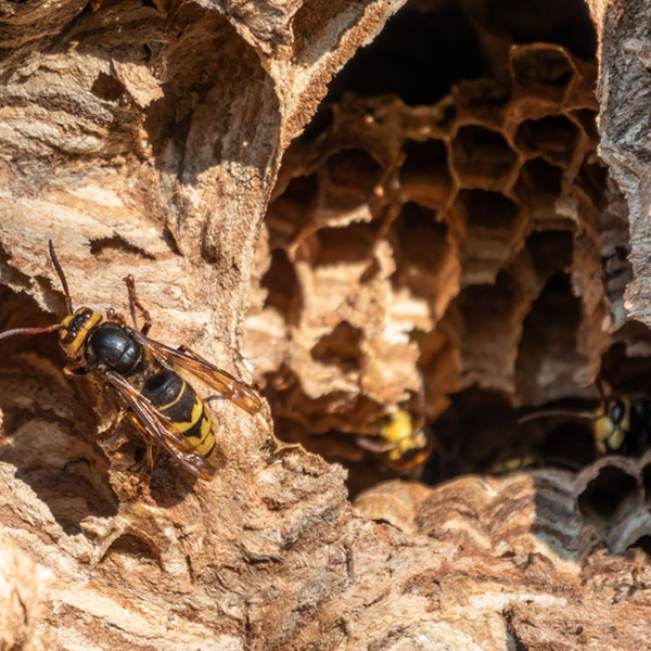 - Vespe cartonaie (Polistes): più snelle e con volo lento, spesso costruiscono nidi grigi a vista, simili a piccoli favi.