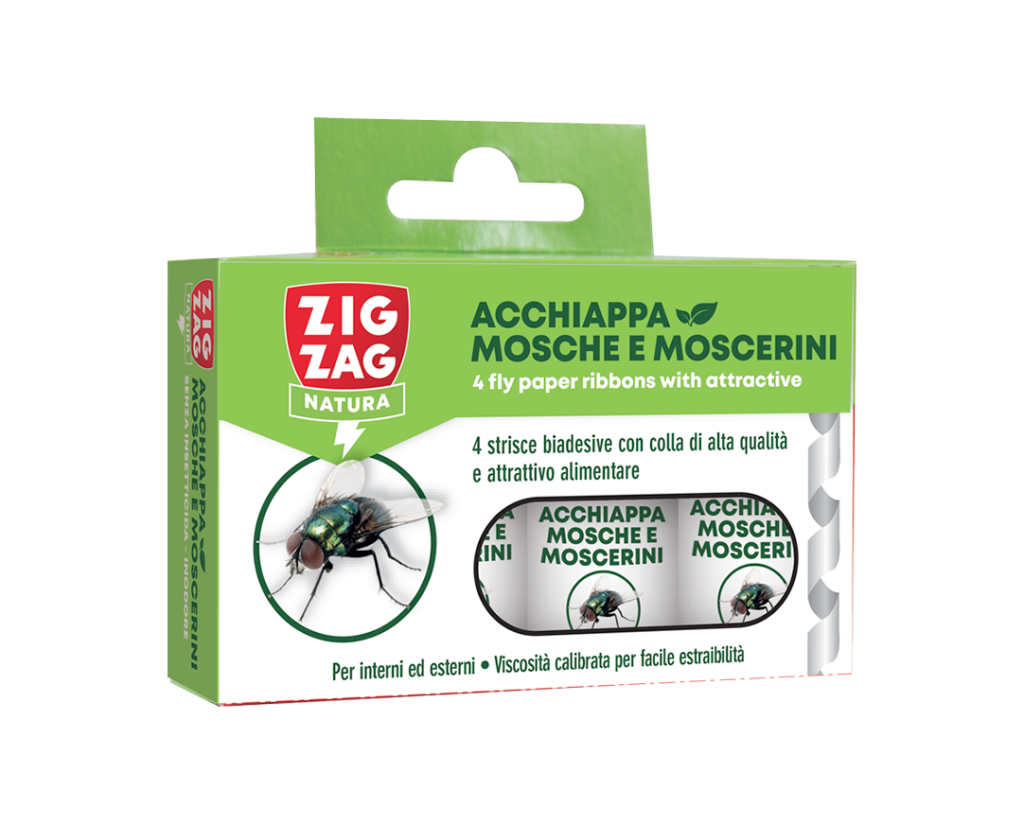 Striscia biadesiva con colla e attrattivo alimentare, efficace per bonificare ambienti interni ed esterni dalle mosche.