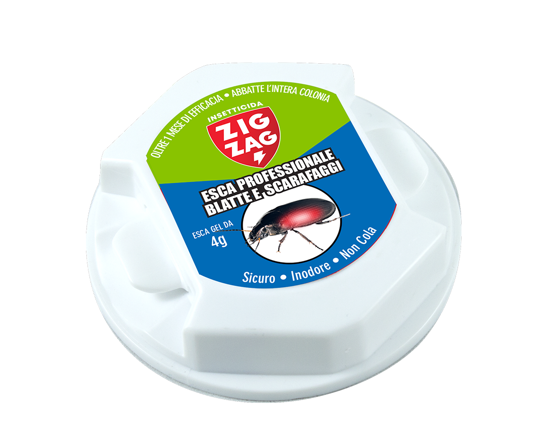 Esca gel pronta all’uso per il controllo di tutte le specie di scarafaggi e blatte, di tutte le età, sia maschi sia femmine. In scatola rigida per renderla più sicura nei confronti di bambini e animali domestici. Contiene sostanze alimentari e additivi (che attraggono gli scarafaggi fino a 1m di distanza) e una sostanza attiva insetticida di nuova generazione. Il gel ha alta palatabilità: stimola il processo di alimentazione delle blatte, garantendo l’assunzione di dosi letali di sostanza attiva. Si ottiene l’eliminazione dell’intera popolazione di blatte dopo circa 5 o 6 giorni dall’applicazione.